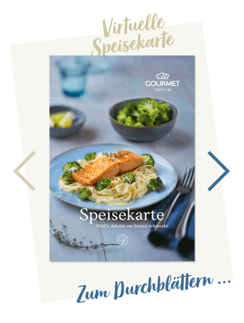Gustieren Sie in unserer virtuellen Speisekarte. Gern schicken wir sie Ihnen ganz unverbindlich mit der Post nach Hause, einfach unten anfordern.