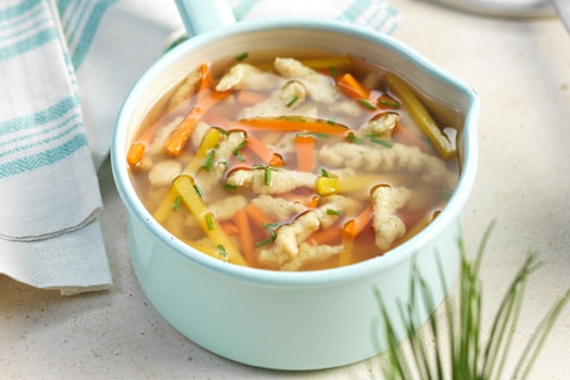 klare Gemüsesuppe mit Kräutertropfteig und Wurzelgemüse