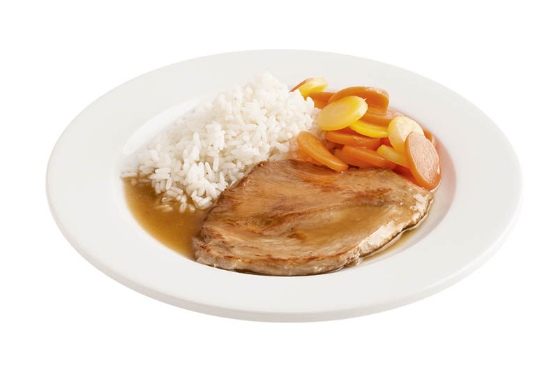 Naturschnitzel in Saft mit Reis und Sonnengemüse.
